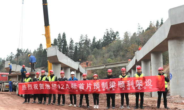 圖為首片梁架設(shè)現(xiàn)場 據(jù)悉,該橋自今年2月份復(fù)工復(fù)產(chǎn)以來,項(xiàng)目部在施工初期克服因疫情導(dǎo)致人員、機(jī)械、材料緊缺的影響,及早部署,并主動與當(dāng)?shù)卣畬幼龊谜鞯夭疬w工作,提前謀劃,全力搶跑,積極落實(shí)疫情防控措施,一手抓防控,一手抓施工,迅速組織人員隊(duì)伍進(jìn)場,優(yōu)化施工組織、合理配置資源,在穩(wěn)步實(shí)現(xiàn)復(fù)工復(fù)產(chǎn)后、施工步伐不斷加快。施工過程中該橋與地方鄉(xiāng)道交叉重疊,一邊確保暢通,一面注重環(huán)境保護(hù),保證施工通行兩不誤。樁基施工中,強(qiáng)化安全質(zhì)量措施落實(shí)落地,完善安全質(zhì)量技術(shù)交底,技術(shù)人員跟班監(jiān)督,為樁基施工提供可靠技術(shù)支撐。