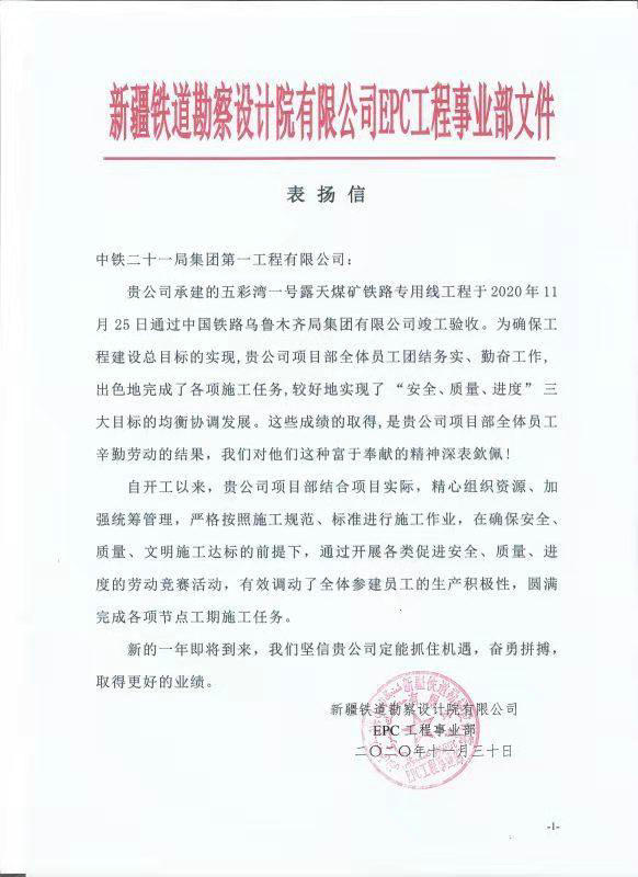 2020年12月1日,中鐵二十一局一公司五彩灣一號(hào)露天煤礦鐵路專用線項(xiàng)目部承建的新疆宜化礦業(yè)有限公司五彩灣一號(hào)露天煤礦鐵路專用線工程,順利通過(guò)烏鐵局集團(tuán)組織的竣工驗(yàn)收,建設(shè)單位新疆鐵路勘查設(shè)計(jì)有限責(zé)任公司對(duì)該項(xiàng)目按期完工并通過(guò)竣工驗(yàn)收發(fā)來(lái)了表?yè)P(yáng)信,給予了高度贊許。