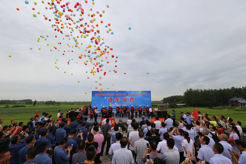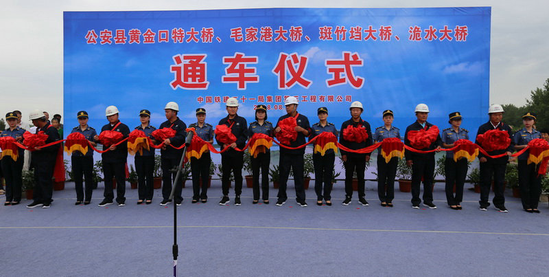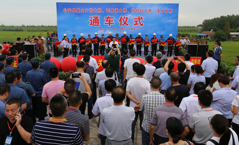 在通車慶典儀式上,首先由公安縣交通運(yùn)輸局局長(zhǎng)孫家軍致辭;然后,中鐵二十一局三公司工會(huì)主席周普華介紹項(xiàng)目建設(shè)情況;公安縣副縣長(zhǎng)馮靳柯宣布四座大橋通車后,在9位交通局工作人員的引導(dǎo)下,8名農(nóng)民工代表為通車儀式剪彩,500多只五顏六色的氫氣球騰空而起,現(xiàn)場(chǎng)一片歡騰。隨后,參加通車慶典的各位領(lǐng)導(dǎo)和嘉賓乘車從幾座大橋上駛過,體驗(yàn)新建大橋便捷的交通。