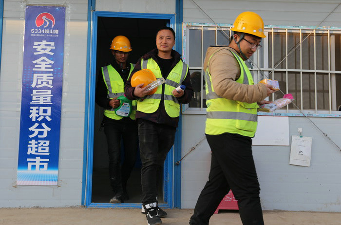 預(yù)制梁場和生活區(qū)施工人員比較集中,為創(chuàng)新安全質(zhì)量管理,項目部別出心裁地開設(shè)了一間“安全質(zhì)量積分超市”。超市的貨架上擺滿了毛巾、香皂、肥皂、牙膏、洗發(fā)水、洗衣液等日常生活用品,要想獲取這些商品不需要用貨幣交易,而是要用平時積累的安全質(zhì)量積分來兌換。項目部安全環(huán)保部部長李慧說:“只有農(nóng)民工才能兌換這些商品。”安全質(zhì)量積分是通過日??记?、安全考核、質(zhì)量考核等方法來獲得。當(dāng)施工人員的積分達到商品的規(guī)定分值時就可以到超市去兌換自己所需的生活用品了。此項措施使現(xiàn)場的安全隱患、質(zhì)量通病得到有效遏制,大大提升了農(nóng)民工參與安全質(zhì)量管理的積極性,讓現(xiàn)場農(nóng)民工在思想上實現(xiàn)由“要我安全”向“我要安全”轉(zhuǎn)變,讓現(xiàn)場作業(yè)人員主動守安全、參與管安全,更讓現(xiàn)場作業(yè)人員感受到了“家文化”的關(guān)懷。