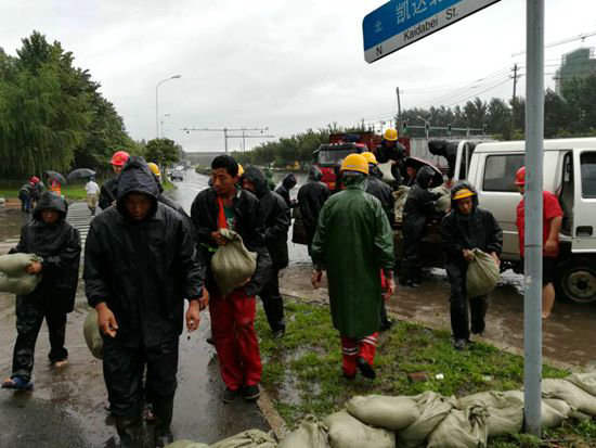 由于中鐵十四局集團(tuán)承建的長春地鐵2號(hào)線西延線汽車公園站,地勢處在該區(qū)域最低位置,周圍地面雨水沿自主大路、凱達(dá)北街和紅旗廣場直接匯聚至凱達(dá)北街與東風(fēng)大街交匯處向北150m的輔路上(汽車公園站),路面積水深度達(dá)90cm左右,已超過施工場地永久圍擋基礎(chǔ),眼看一場難以抗拒的自然災(zāi)害即將來臨。這時(shí),現(xiàn)場巡視員迅速將這一險(xiǎn)情報(bào)告項(xiàng)目部,項(xiàng)目部接到險(xiǎn)情報(bào)告后,立即啟動(dòng)防汛應(yīng)急預(yù)案,并迅速組織36人趕赴現(xiàn)場搶險(xiǎn),其中7人負(fù)責(zé)對(duì)東側(cè)排水系統(tǒng)進(jìn)行疏通,9人負(fù)責(zé)安設(shè)水泵對(duì)基坑進(jìn)行抽排水,其余20人負(fù)責(zé)裝沙袋,隨時(shí)準(zhǔn)備攔截洶涌而來的雨水……