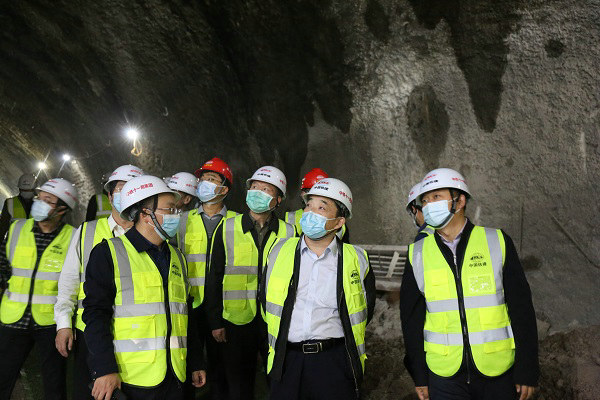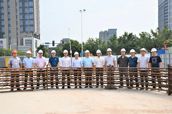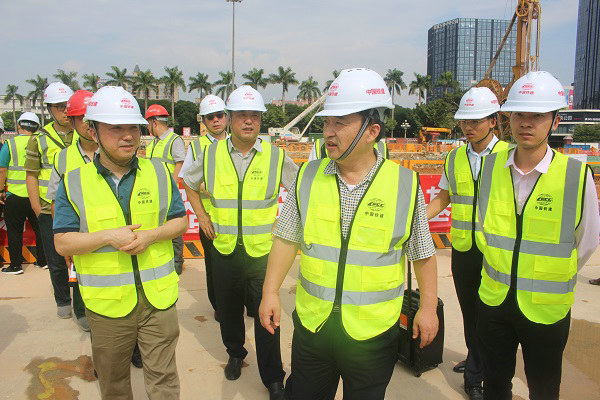 項(xiàng)目負(fù)責(zé)人中國(guó)鐵建股份公司總工程師雷升祥(右2),課題負(fù)責(zé)人中鐵十一局資深首席專(zhuān)家張旭東(左1)一行調(diào)研番禺廣場(chǎng)站施工現(xiàn)場(chǎng)