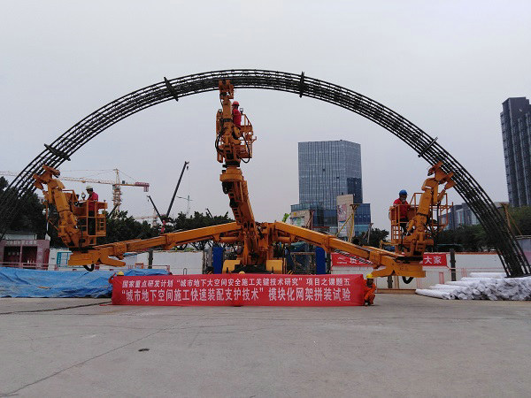 中鐵十一局集團(tuán)作為“城市地下空間施工快速裝配支護(hù)技術(shù)”課題承擔(dān)單位,由課題負(fù)責(zé)人、中鐵十一局集團(tuán)資深首席專(zhuān)家張旭東帶領(lǐng)技術(shù)中心、博士后工作站研發(fā)骨干及課題參與單位研究人員,多次深入施工現(xiàn)場(chǎng),開(kāi)展裝配支護(hù)理論、快速施工技術(shù)及配套施工裝備研究,揭示了淺埋暗挖快速裝配式支護(hù)結(jié)構(gòu),臨近掌子面的受力變形時(shí)空效應(yīng)特征,提出了大剛度、模塊化網(wǎng)架面支護(hù)結(jié)構(gòu)設(shè)計(jì)方法,研發(fā)了系列模塊化網(wǎng)架結(jié)構(gòu)和快速連接接頭,研制了具有多方向自行走、重型構(gòu)件抓舉、快速定位、精準(zhǔn)拼裝功能的新型三臂多功能作業(yè)臺(tái)車(chē),形成了快速裝配式支護(hù)成套技術(shù),實(shí)現(xiàn)了巖體開(kāi)挖后1.7小時(shí)內(nèi)形成面支護(hù),迅速抑制圍巖變形,保障了地下空間施工安全。