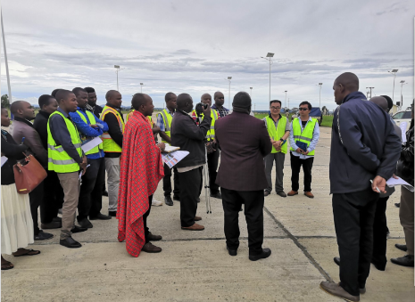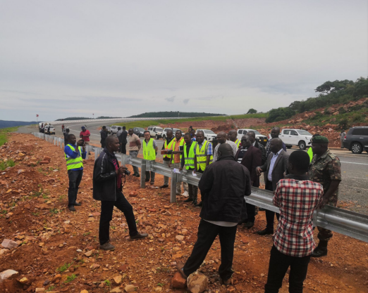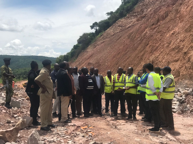 中午時分,于KM107+100處石方高挖方路段,十五局駐坦桑尼亞112km項目負(fù)責(zé)人高海龍對高挖方施工工藝、安全標(biāo)準(zhǔn)、環(huán)境管理和當(dāng)?shù)亟煌ü芸氐葘Ω辈块L一行做了詳細匯報。隨后,視察團參觀了高挖方區(qū)域的現(xiàn)場情況并對我方施工管理給予了高度贊揚。副部長先生強調(diào),此高挖方路段在坦桑尼亞較為罕見,施工難度較大,并進一步對安全管理和交通管控進行了明確指示。