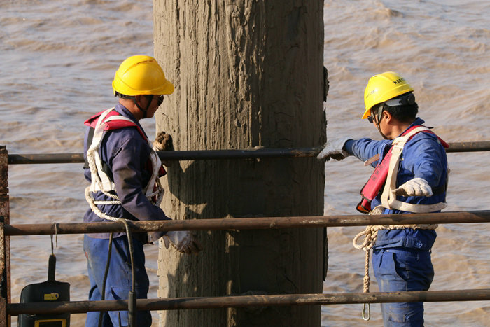 該公司承建的濱海高架、濱?;ネㄈL14.6公里,設(shè)計樁基1745根,樁基是兩座大橋810座橋墩的下部結(jié)構(gòu),樁基建設(shè)速度的快慢對橋墩施工進度有直接影響。對此,該項目部組織鋼棧橋搭設(shè)隊伍進行晝夜打入海底鋼管樁、焊接穩(wěn)固鋼架結(jié)構(gòu)及安裝貝雷梁和橋面板、在鋼棧橋附屬作業(yè)平臺領(lǐng)跑下部結(jié)構(gòu)各工序前提下,由樁基隊進行98米鋼護筒打插施工。進入去年12月份,受寒潮、大風(fēng)、冰凍天氣影響,夜間氣溫在零下6度以下,風(fēng)力達到8到10級,從施工安全考慮,被迫停止作業(yè),人員撤至安全地帶。為保證樁基施工進度,項目部采取天氣晴好、氣溫較高的時間段組織多臺履帶吊、鉆孔機并行施工,人機不停地連續(xù)作戰(zhàn),以日均5根樁的高速度向前推進。