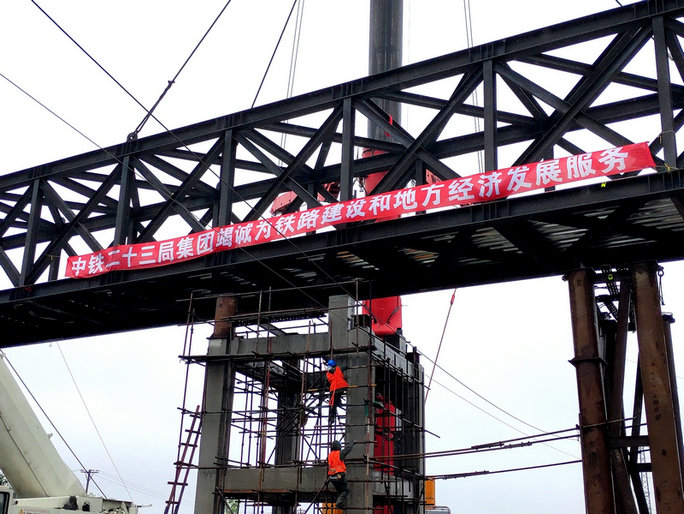 該人行天橋地處濱綏鐵路阿城火車站北場,既是鐵路運輸?shù)难屎硪?,又是市民出行的必?jīng)之路,備受各方廣泛關(guān)注。中鐵二十三局集團二公司哈牡項目部,在鐵路三級轉(zhuǎn)二級連續(xù)160分鐘的封鎖施工中,克服了跨越既有線和接觸網(wǎng)作業(yè)安全風(fēng)險高、吊裝跨度大、作業(yè)面狹窄、風(fēng)雨交加氣候多變等重重困難,與中國鐵路哈爾濱局集團有關(guān)運輸站段緊密配合,通力協(xié)作。先后召開三次施工例會,對施工方案進行了反復(fù)研究和科學(xué)優(yōu)化,調(diào)集了600噸、500噸和350噸全地面起重機各一臺,并提前進行了吊車站位,地基承載力和鋼結(jié)構(gòu)探傷試驗。同時制定了周密的架梁專項施工方案、作業(yè)流程圖和應(yīng)急預(yù)案。對各工序及作業(yè)環(huán)節(jié)進行定人、定崗、定責(zé),對施工技術(shù)標(biāo)準(zhǔn)和安全質(zhì)量進行詳細(xì)交底。參戰(zhàn)人員各盡其責(zé),嚴(yán)格執(zhí)行營業(yè)線施工、安全管理規(guī)定,確保了人行天橋吊裝施工的順利完成,為今后同類施工積累了寶貴經(jīng)驗。