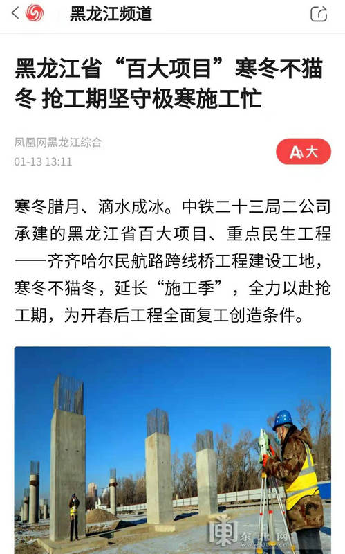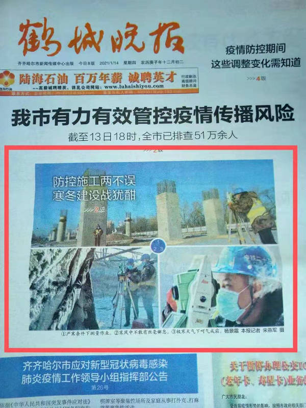 齊齊哈爾民航路跨線橋建設(shè)工地,寒冬不貓冬,延長“施工季”,馬不停蹄地投入到龍江百大項(xiàng)目“火熱之冬”建設(shè)會戰(zhàn)之中,他們爭分奪秒搶進(jìn)度,為節(jié)后復(fù)工復(fù)產(chǎn)創(chuàng)造條件的感人故事受到媒體的廣泛關(guān)注?!洱R齊哈爾日報(bào)》《鶴城晚報(bào)》記者專程深入一線采訪報(bào)道。元月14日,《鶴城晚報(bào)》頭版用三分之二的篇幅,以“防控施工兩不誤、寒冬建設(shè)戰(zhàn)猶酣”為題刊發(fā)組照進(jìn)行重點(diǎn)報(bào)道,同時在當(dāng)天報(bào)紙二版“來自重點(diǎn)項(xiàng)目建設(shè)一線的報(bào)道”專欄配發(fā)了700余字的消息,對建設(shè)者們?yōu)榱藭惩Q城百姓出行,推動地方經(jīng)濟(jì)發(fā)展做出的貢獻(xiàn)贊賞有加。