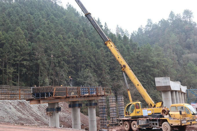 圖為吊裝橋梁蓋梁鋼筋籠 旱季攻勢(shì)結(jié)碩果,百尺竿頭再發(fā)力。項(xiàng)目部超前部署,統(tǒng)籌謀劃施工方案,多次召開復(fù)工施工部署會(huì),采取加班加點(diǎn),每日考核,夜以繼日追趕工期。在預(yù)制鋼梁板場(chǎng),龍門吊不停吊裝鋼筋,混凝土,模板,10余名作業(yè)人員有條不紊地進(jìn)行綁扎,澆筑。在緊張施工的6#橋工地,吊車有序運(yùn)轉(zhuǎn)加緊澆筑墩柱臺(tái)帽,作業(yè)人員進(jìn)行模板安裝、震搗,機(jī)械轟鳴,車輛穿梭,現(xiàn)場(chǎng)一片繁忙景象;鋼筋加工場(chǎng)20余名作業(yè)人員頭戴安全帽,緊張有序忙碌著綁扎,焊接,切割,忙而不亂。春節(jié)期間項(xiàng)目部100余名作業(yè)人員積極響應(yīng)“就地過年”號(hào)召,春節(jié)假期不停工,堅(jiān)守崗位,發(fā)揚(yáng)連續(xù)作戰(zhàn)的工作作風(fēng)。