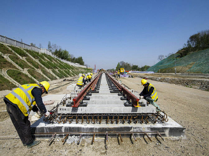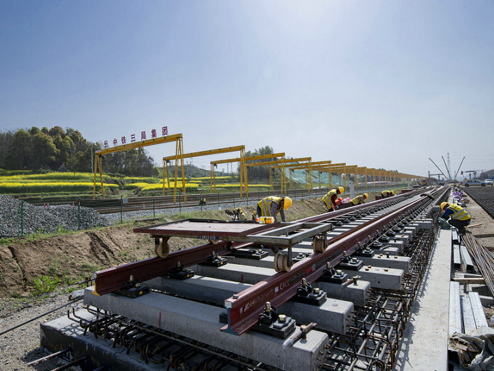 黃黃鐵路浠水南站無(wú)砟道岔施工現(xiàn)場(chǎng)