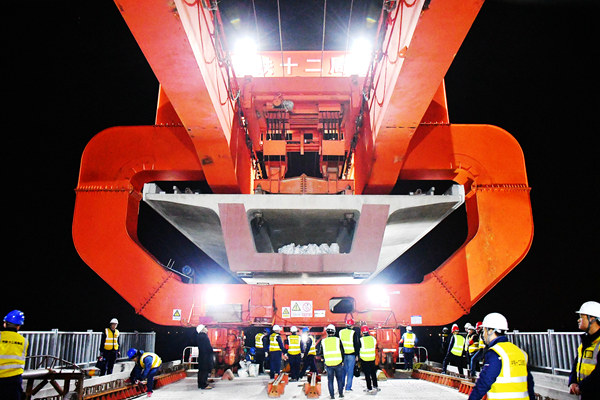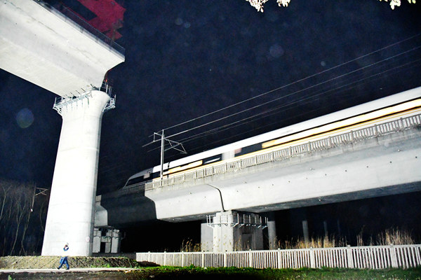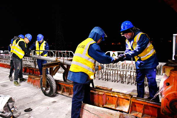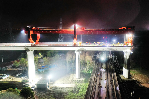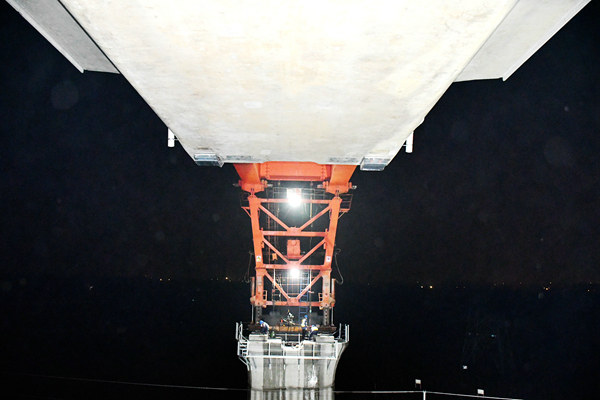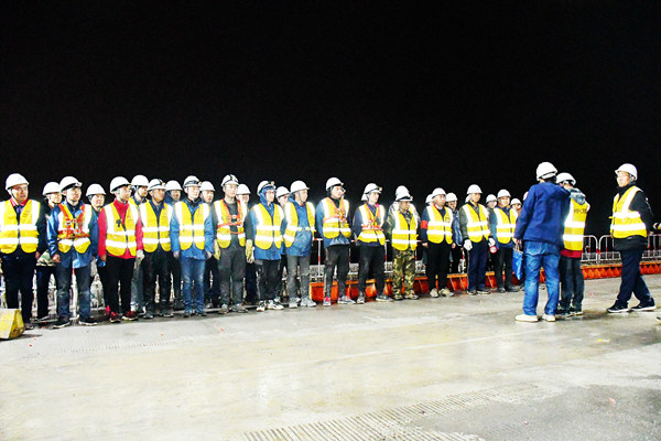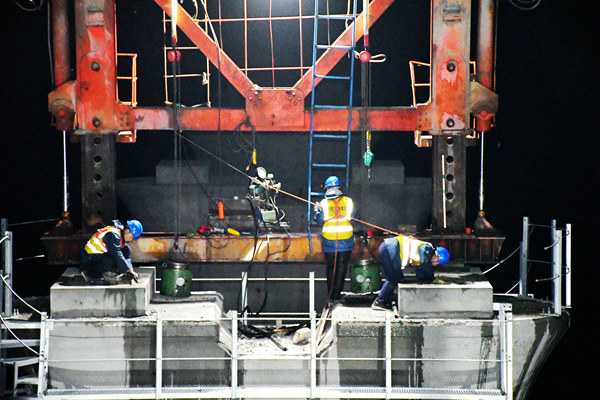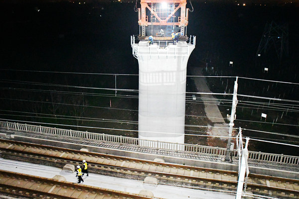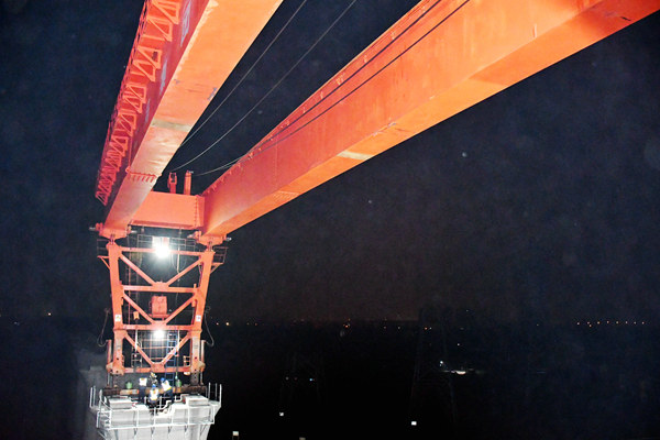 中國鐵路工程建設(shè)網(wǎng)江蘇江陰訊(特約通訊員 鄭建軍)3月18日深夜,南沿江城際鐵路跨京滬高鐵特大橋的架梁現(xiàn)場燈火通明,亮如白晝。大橋上,駐站聯(lián)絡(luò)員已經(jīng)就位并進行了登記;兩排訓(xùn)練有素、身穿反光馬甲的施工人員列隊在施工現(xiàn)場,施工負責(zé)人手拿喇叭站在前面;不遠處,一輛號稱“巨無霸”的運梁車裝載著32.6米、835噸的箱梁正停在325號墩上嚴陣以待;現(xiàn)場點名、機具清點均已完成。3月19日0時30分,隨著施工負責(zé)人的一聲“開始”,施工人員聞聲展開了施工大戰(zhàn)——至此,2021年上海局集團首次高規(guī)格的、南沿江城際鐵路唯一一處跨越京滬高速鐵路的二級封鎖施工大戰(zhàn)正式拉開帷幕。