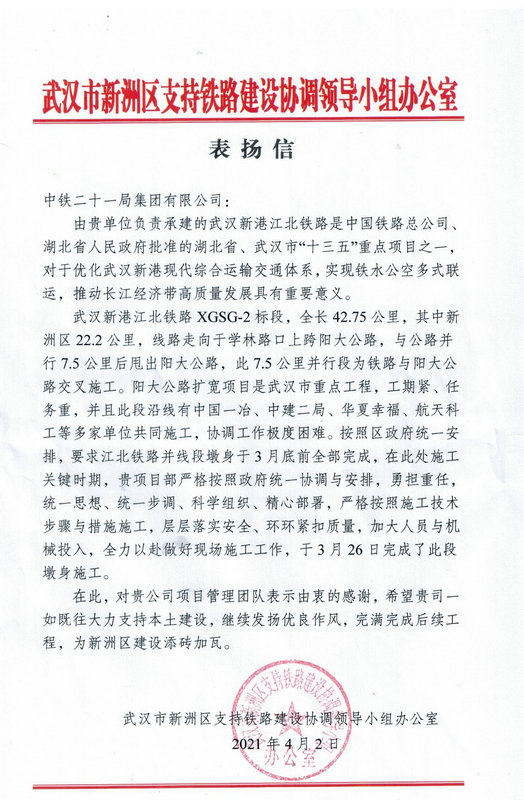 近日,中鐵二十一局一公司收到武漢市新洲區(qū)表揚信,對該公司武漢江北鐵路項目部組織力量攻克“卡脖子”工程,確保各項重點工程建設(shè)同步推進(jìn)提出表揚。