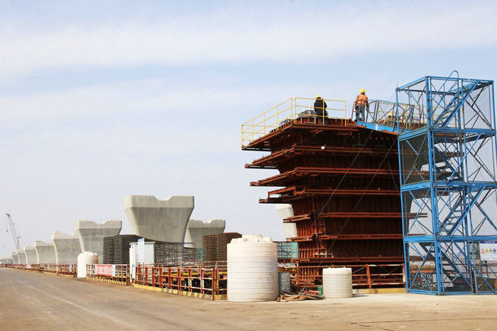 該公司承建的杭甬復(fù)線高速公路S3合同段濱海高架和濱?;ネ?,主要工程量有:1745根平均長98米的樁基、384座承臺、810座橋墩、8座匝道橋、4座拼寬橋,全長14600米。為便于施工,架設(shè)2座支棧橋、1座主棧橋及互通棧橋和近200個作業(yè)平臺。濱海高架橋上部結(jié)構(gòu)為8孔40米、77孔50米預(yù)制箱梁+135米的連續(xù)梁。下部為鉆孔樁、承臺、花瓶式墩結(jié)構(gòu),橋梁跨越擬建、在建的排污管道、原油管道、給水管道、取水盾構(gòu)隧道、LNG管線和通訊光纜等17道管線。濱?;ネǖ暮S蛎娣e為613.03畝,上跨下穿金塘大橋,造型為苜蓿葉單環(huán)互通式、槽口型鋼砼組合梁。兩座橋澆筑砼68萬立方、鋼材消耗6.7萬噸。濱?;ネ屑~是目前亞洲最大的海上立交,是集團公司重點項目,該公司的重難點項目,規(guī)模大、質(zhì)量要求高、施工難度大。