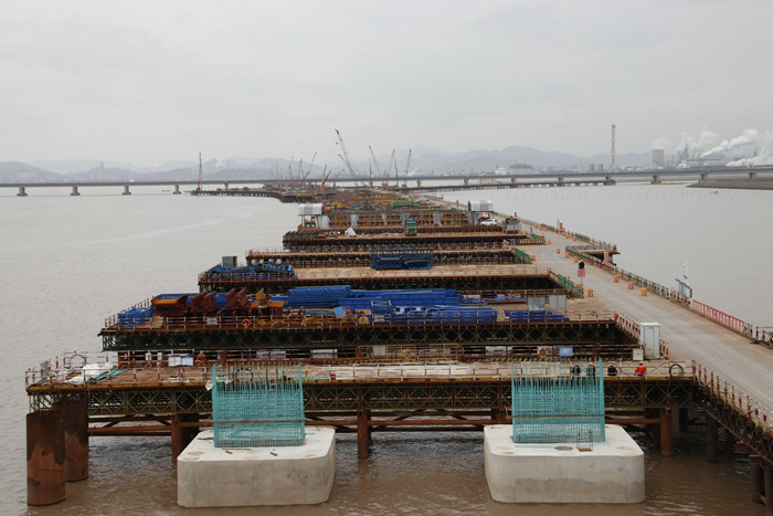 該公司杭甬項目部高起點打造優(yōu)質(zhì)工程,公司副總工程師兼杭甬項目負責(zé)人黃偉在施工動員大會上明確表態(tài):“我們要干就必須干出優(yōu)質(zhì)工程,這關(guān)乎十五局在浙江的發(fā)展,沒有任何退路!”這句擲地有聲的話讓員工有了足夠的信心。項目部組建了一個綜合管理能力強的團隊,擁有管理、技術(shù)等各方面人才。同時通過公開招標(biāo),擇優(yōu)選用20多支可承擔(dān)經(jīng)濟風(fēng)險的棧橋、下部結(jié)構(gòu)、鋼筋和鋼護筒加工施工隊,錄用50多家有資金墊付能力、可提供優(yōu)質(zhì)服務(wù)的材料供應(yīng)商。其次組建了一座大型混凝土拌合站、1座上萬平方米的鋼筋、鋼護筒加工場。在施工、材料供應(yīng)過程中,對施工能力達不到要求的施工隊,供應(yīng)材料不及時,履行合同不到位的供應(yīng)商堅決清場,絕不允許名不副實、濫竽充數(shù)者存在。正確的管理理念和有力的舉措,為優(yōu)質(zhì)高效建設(shè)濱海高架、濱?;ネù蛳铝藞詫嵒A(chǔ)。