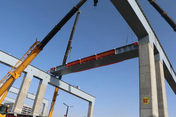 本網甘肅蘭州4月13日訊(通訊員 張東升 馮轉紅)4月12日,中鐵二十一局三公司中川機場T3航站樓連接線T3-4項目首跨鋼箱梁架設成功,標志著該項目取得關鍵節(jié)點突破,橋梁鋼箱梁架設工作全面展開,進入下一施工階段。
