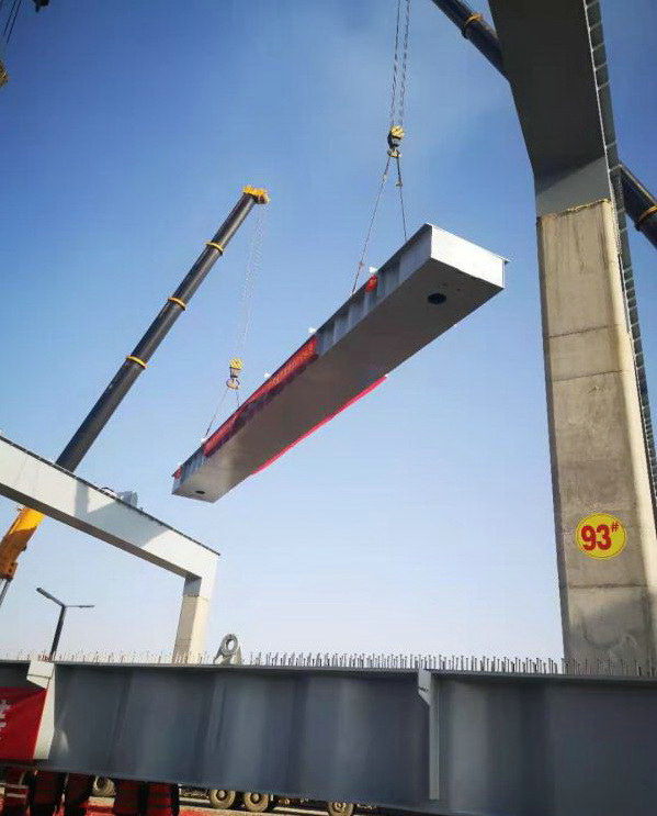 為保證首跨鋼箱梁順利架設,該項目編制并完善鋼箱梁架設施工方案,多次調查商討現場施工細節(jié),排查運輸線路安全隱患,召開鋼箱梁架設施工部署專題會,多措并舉、多管齊下、多方合力確保鋼箱梁架設施工順利進行。同時,鋼箱梁架設施工過程中,項目管理辦公室主任張訸、T3-4項目負責人王亞鋒帶領班子成員密切關注施工動態(tài),合理安排施工組織,盯控鋼箱梁架設過程;安全管理人員疏導施工車輛,確保施工通道交通順暢,現場技術員指揮吊車位置、吊梁順序、落梁點,保證梁體縱坡及橫坡準確,一次安裝到位。項目管理人員協同聯動、施工作業(yè)人員積極配合,架梁工作有條不紊,順利進行。首跨鋼箱梁于當天上午8點28分開始架設,僅用時5小時架設成功。