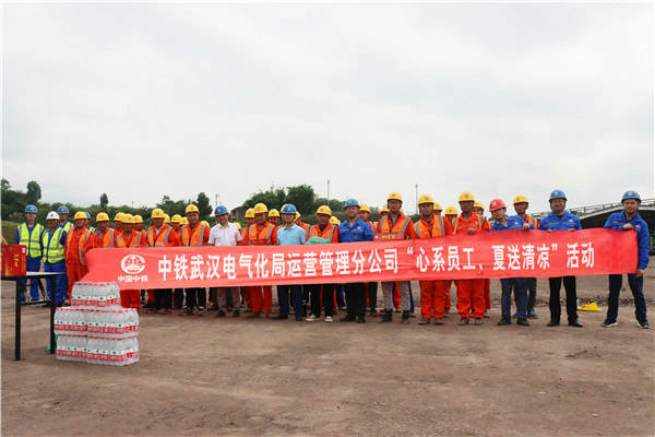 5月14日上午,中鐵武漢電氣化局重慶軌道交通4號線二期項目部接觸網(wǎng)作業(yè)隊正在進行緊張的施工作業(yè),此時現(xiàn)場迎來了一位特殊的客人。分公司黨委副書記(主持黨委工作)馬良兵同志帶著公司的關(guān)懷和工會組織的關(guān)愛,為戰(zhàn)斗在重慶軌道交通4號線上的全體將士“送清涼、送安全、送健康”,給現(xiàn)場的同志們帶去了王老吉、西瓜、藿香正氣水等清涼用品。馬良兵檢查了作業(yè)現(xiàn)場后,又到作業(yè)隊駐地察看生活條件,對一線職工的艱辛付出給予了充分的肯定并表示誠摯的感謝,同時叮囑大家在夏季施工期間,要特別注意防暑降溫工作。