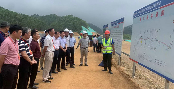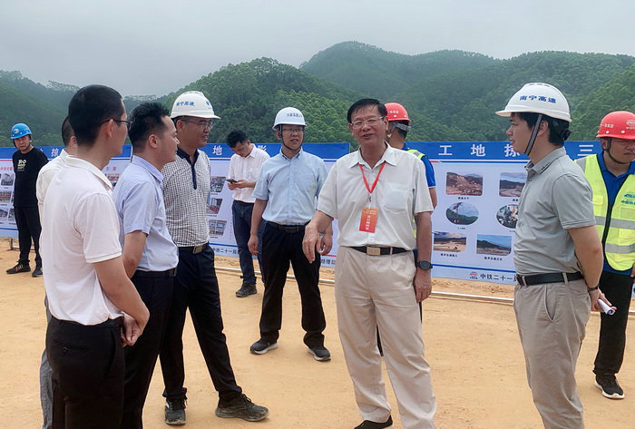 圖為南寧市政協(xié)領(lǐng)導(dǎo)聽(tīng)取工程情況介紹 陳平互通距賓陽(yáng)南樞紐立交14.49公里,主要工程包括:主線橋梁三座、匝道橋梁四座,共計(jì)全長(zhǎng)1792米;涵洞四座;土石方挖方237.7萬(wàn)方;土石方填方208.8萬(wàn)方。設(shè)置一處收費(fèi)站,收費(fèi)站規(guī)模2進(jìn)2出。工程概算總造價(jià)3.23億元。2020年8月15日開(kāi)工。目前路基、橋梁樁基基本完成,橋梁墩柱和預(yù)制梁片施工正全面展開(kāi)。開(kāi)工累計(jì)完成投資2.68萬(wàn)元,占總投資82.9%。