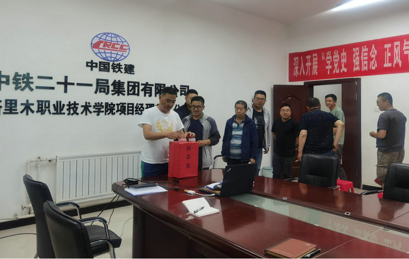 5月24日,中鐵二十一局四公司塔里木職業(yè)技術(shù)學院項目部全體職工在項目書記的帶領(lǐng)下,開展為“5.22”青海省瑪多縣地震災區(qū)捐款活動。