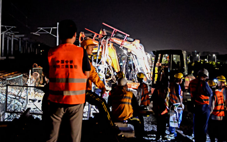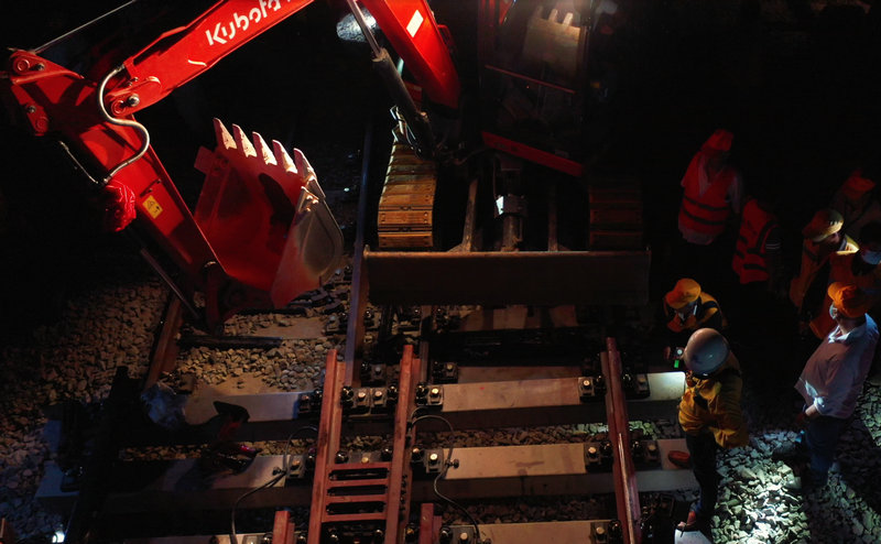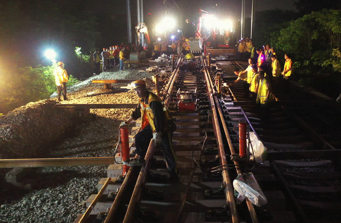 為確保武岡城際鐵路營業(yè)線黃岡西站道岔順利插鋪施工,中鐵三局線橋公司黃黃項目部積極響應(yīng)武九客專湖北公司有關(guān)營業(yè)線施工安全、質(zhì)量及技術(shù)要求,提前數(shù)月進(jìn)行鐵路局各站段簽署各種施工安全協(xié)議、線路預(yù)鋪、道岔預(yù)鋪、配合工務(wù)部門站改信號過渡施工,換裝新的LKJ基礎(chǔ)數(shù)據(jù)等準(zhǔn)備工作。先后召開5次營業(yè)線道岔插鋪施工準(zhǔn)備會,成立技術(shù)、安全、防護(hù)、機械、施工等5個小組,提前對道岔位置、撥接長度、線路標(biāo)高等技術(shù)資料反復(fù)核對,對現(xiàn)場防護(hù)作業(yè)人員進(jìn)行全員培訓(xùn),制定站改專項施工方案、應(yīng)急預(yù)案并經(jīng)多次論證確定最終方案。施工時線橋公司副總經(jīng)理王亮明帶領(lǐng)公司工程技術(shù)開發(fā)部、安質(zhì)部等相關(guān)部門專家進(jìn)行現(xiàn)場盯控指導(dǎo),確保站改施工萬無一失,準(zhǔn)時消點開通。