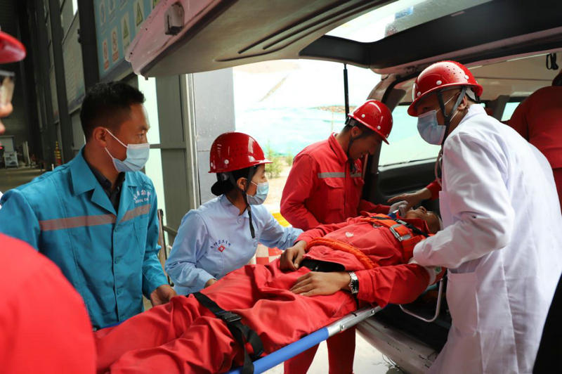 此次演練模擬化隆砂石廠生產(chǎn)車間一名機(jī)修工人在檢修過(guò)程中不慎墜落地面,安全員立即報(bào)告現(xiàn)場(chǎng)負(fù)責(zé)人,現(xiàn)場(chǎng)負(fù)責(zé)任及時(shí)上報(bào)上級(jí)領(lǐng)導(dǎo),并立即啟動(dòng)《高處墜落事故應(yīng)急預(yù)案》?,F(xiàn)場(chǎng)演練分通訊聯(lián)絡(luò)、搶險(xiǎn)救災(zāi)、醫(yī)療救護(hù)、安全警戒、事故調(diào)查、后勤保障六個(gè)小組,發(fā)現(xiàn)墜落人員后,現(xiàn)場(chǎng)安全員立即報(bào)告現(xiàn)場(chǎng)指揮,現(xiàn)場(chǎng)指揮及時(shí)報(bào)告總指揮并通知各應(yīng)急小組,經(jīng)過(guò)安全警戒、現(xiàn)場(chǎng)急救,及時(shí)將傷員送往醫(yī)院,各小組有序展開(kāi)救援。