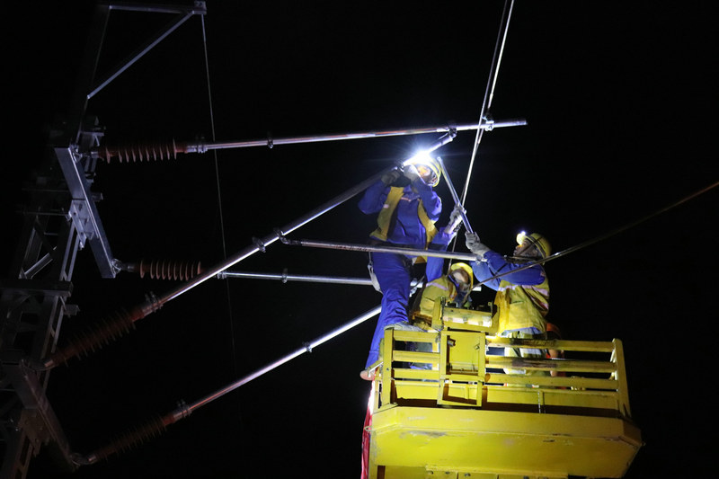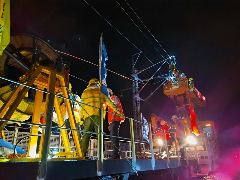 為做好大瑞鐵路首條接觸導線架設(shè)工作,大瑞項目部組織施工作業(yè)班組和軌道車司助人員召開專題施工生產(chǎn)會,針對接觸導線架設(shè)施工流程,制定專項施工方案和安全卡控措施,認真準備工機具,細化分工,確保每個環(huán)節(jié)落實到人。23時整,全體施工人員緊密配合,經(jīng)過90分鐘緊張有序的作業(yè),成功架設(shè)全長1613米的第一條接觸導線。
