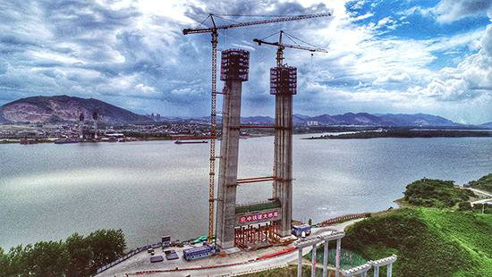 石首長(zhǎng)江大橋全長(zhǎng)2670米,為主跨820米的雙塔單側(cè)混合梁斜拉橋,主塔塔高232米,位列國(guó)內(nèi)斜拉橋前20?;炷亮簢?guó)內(nèi)首次采用預(yù)制提升滑移膠拼施工方法。項(xiàng)目成功解決了超高主塔快速施工及線(xiàn)形控制問(wèn)題。大橋主塔已經(jīng)封頂,混凝土箱梁膠拼施工也將完工,大橋進(jìn)入鋼箱梁吊裝施工階段。