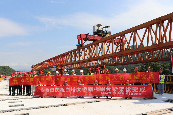 本網(wǎng)安徽黃山7月7日訊(通訊員 王克亮)在慶祝建黨100周年的日子里,隨著最后一跨鋼板組合梁在指揮的哨聲中緩緩落下,中鐵二十一局三公司池祁高速12A標(biāo)項目部承建施工的白塔大橋鋼板組合梁經(jīng)過緊張有序施工于今天上午全部鋪架完成。項目辦代表處部長李占甫、駐地辦高監(jiān)謝曉飛等領(lǐng)導(dǎo)前來現(xiàn)場共同見證了慶祝儀式。