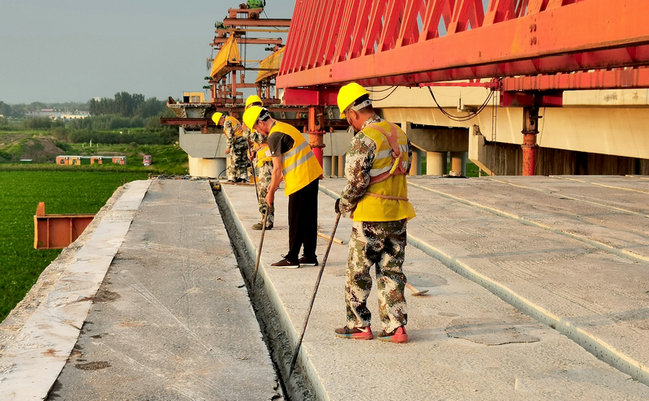 新鄉(xiāng)牧野大橋第8跨空心板梁吊裝拆除施工為營(yíng)業(yè)線Ⅱ級(jí)施工,14塊板梁長(zhǎng)30 米 ,寬14米,跨越鐵路跨度為30m,計(jì)劃在11次垂直天窗點(diǎn)內(nèi)完成全部板梁拆除施工任務(wù)。施工現(xiàn)場(chǎng),中原建設(shè)者們分工協(xié)作,在40分鐘垂直天窗點(diǎn)內(nèi)用千斤頂對(duì)空心板梁進(jìn)行鉸縫頂推施工,并觀測(cè)橋面及梁板的受力變化及受力均衡狀態(tài),同時(shí)在橋面上觀察橋面板的頂推情況,及時(shí)指揮協(xié)調(diào),確保安全可控。