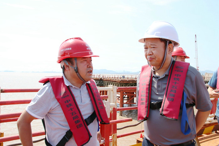 隨后,樊獻(xiàn)鵬從濱?;ネㄇ巴谑┕さ臑I海高架20號墩現(xiàn)場,駐足查看了鉆孔機(jī)作業(yè)過程,未發(fā)現(xiàn)不規(guī)范等問題。他望著屹立于海面上的140多座內(nèi)實(shí)外美的濱海高架橋墩和一塵不染的鋼棧橋,高興地說:“中鐵十五局的質(zhì)量安全、進(jìn)度環(huán)保是好樣的,對央企的管理我是放心的!”樊獻(xiàn)鵬指出:杭甬一期已進(jìn)入攻堅階段,在管理上只能加強(qiáng),不能松懈,笑到最后才是最終勝利。目前是暑天,海上的氣溫,加上鋼棧橋的溫度,比陸地高多了,一定要做好防暑降溫工作,采取有力措施避免作業(yè)人員被火辣辣的太陽曬傷皮膚,避免中暑,要把員工生命健康放在第一位,讓他們吃好、睡好,精力充沛地投入工作。同時,最近是暴雨洪水頻發(fā)季節(jié),要做好海上作業(yè)防護(hù)工作,不能因?yàn)橼s進(jìn)度而不顧員工的生命安全。其次,下一步要組織好鋼箱梁施工,人員、設(shè)備、資金投入要到位,要落實(shí)好各項措施,要打有備之戰(zhàn),以優(yōu)良的質(zhì)量,萬無一失的安全,快速的進(jìn)度,打一場漂亮戰(zhàn)。