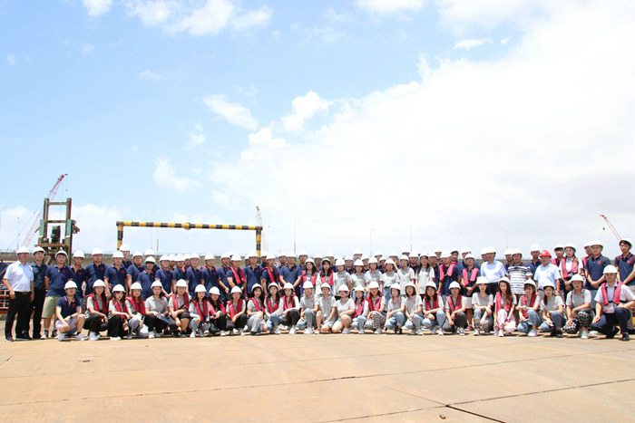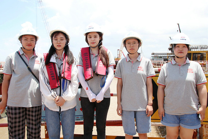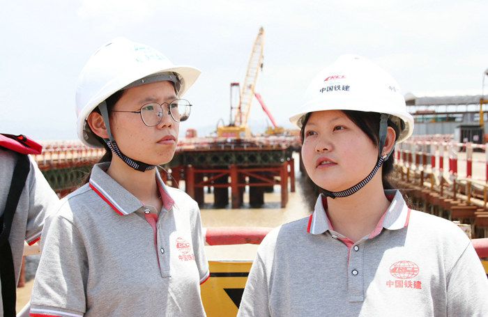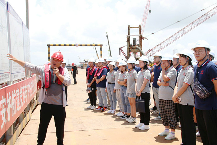 隨后,組織大學(xué)生到濱?;ネê蜑I海高架觀摩。當(dāng)大巴車載著學(xué)生們進(jìn)入施工現(xiàn)場(chǎng)的時(shí)候,他們被海上兩座大橋雄偉壯觀的場(chǎng)景深深地吸引,紛紛舉起手機(jī)拍照。該項(xiàng)目副經(jīng)理喬繼保向大學(xué)生介紹了項(xiàng)目的安全質(zhì)量、進(jìn)度產(chǎn)值,以及工程進(jìn)展情況。