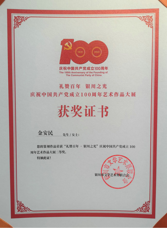 7月21日,中鐵二十一局四公司職工金安民的篆刻作品榮獲銀川市文學(xué)藝術(shù)界聯(lián)合會舉辦的“禮贊百年·銀川之光”慶祝中國共產(chǎn)黨成立100周年藝術(shù)作品大展二等獎。