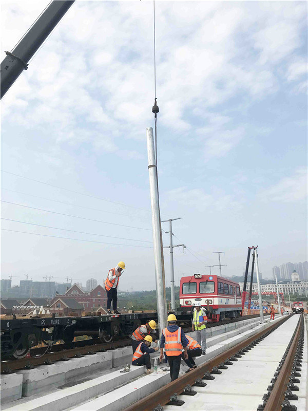 重慶軌道交通4號(hào)線二期正線接觸網(wǎng)第一根組立 ,站后系統(tǒng)設(shè)備安裝工程進(jìn)入全面施工階段。 張彬攝