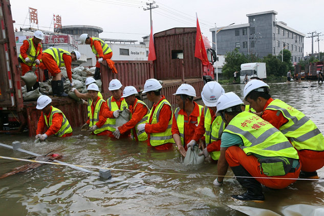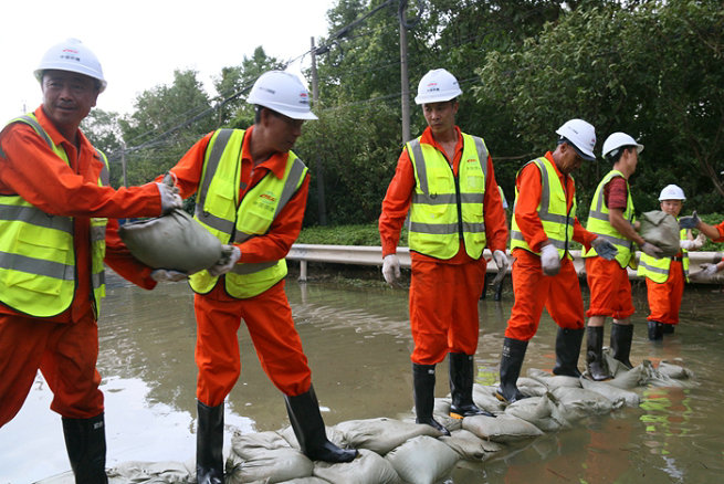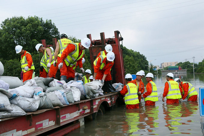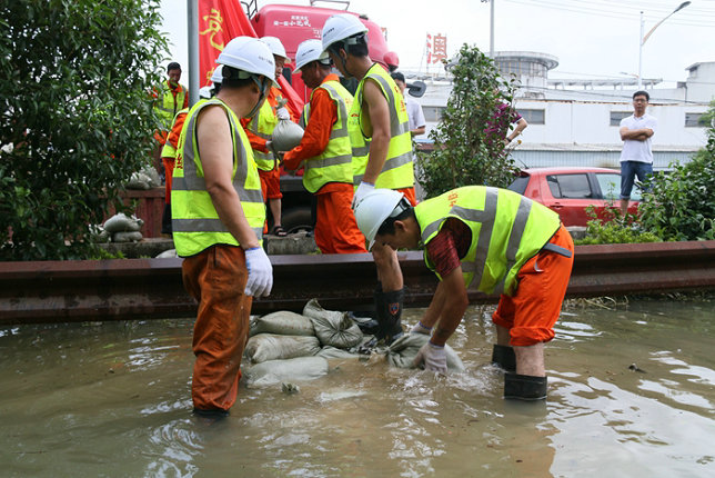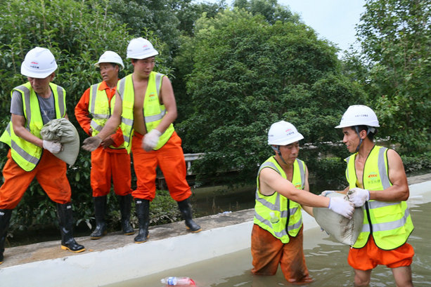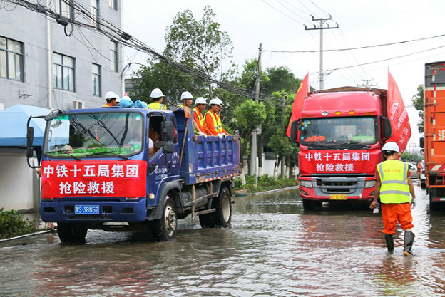 28日清晨,杭甬項(xiàng)目部接到寧波市防洪防汛指揮部的指令:中鐵十五局馬上組織搶險(xiǎn)隊(duì)伍到寧波海曙區(qū)古林鎮(zhèn)搶險(xiǎn)救災(zāi)!古林鎮(zhèn)地勢(shì)較低,受臺(tái)風(fēng)暴雨影響,海水倒灌,全鎮(zhèn)9條四通八達(dá)的道路被淹、上萬(wàn)間房屋底樓和多家工廠積水20—50厘米,位于鄞縣大道與機(jī)場(chǎng)路交叉的凈高6米的洞橋(立交),被海水淹沒(méi),車(chē)輛和行人無(wú)法通行,全鎮(zhèn)多個(gè)村莊和工廠斷水?dāng)嚯?,?yán)重影響了古林鎮(zhèn)村民的生活和生產(chǎn)。險(xiǎn)情就是命令!該項(xiàng)目部迅速派出一支40人的搶險(xiǎn)隊(duì),出動(dòng)8輛貨車(chē)、小車(chē)直奔受災(zāi)的鄞縣古林。鄞縣大道有3處路面積水需要用沙堤阻斷,并將涌水口堵住。