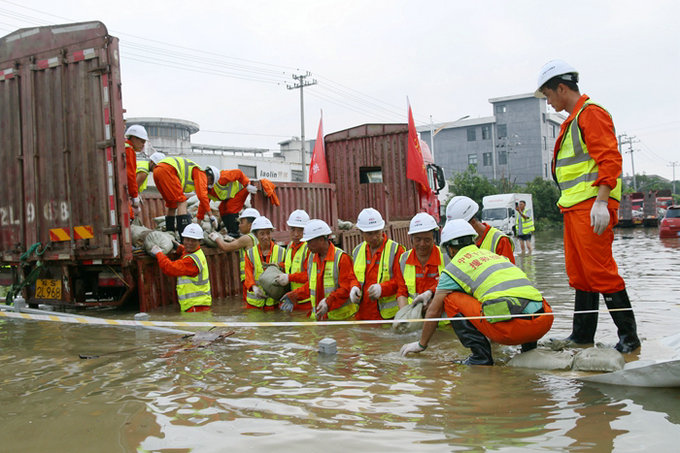 海曙交通局給搶險(xiǎn)隊(duì)員送來(lái)了盒飯,志愿者組織送來(lái)了240個(gè)烙餅,古林鎮(zhèn)政府送來(lái)40箱面包和20件礦泉水。吃著餅子、面包,喝著礦泉水,搶險(xiǎn)隊(duì)員們干勁更足,在水中堆碼沙袋更快。