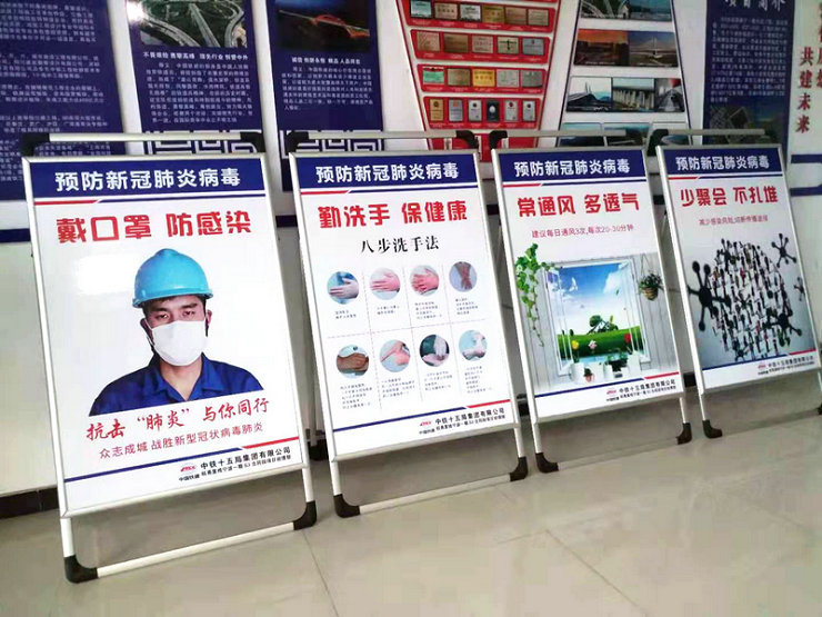 其次,在項目部、施工現(xiàn)場張貼、懸掛新冠肺炎防控宣傳畫和標語,并利用會議等形式對員工進行疫情防范教育,使大家養(yǎng)成勤洗手、愛干凈習慣,從思想上、行動上引起足夠重視,同心協(xié)力打一場新冠疫情防疫仗,確保一方平安。