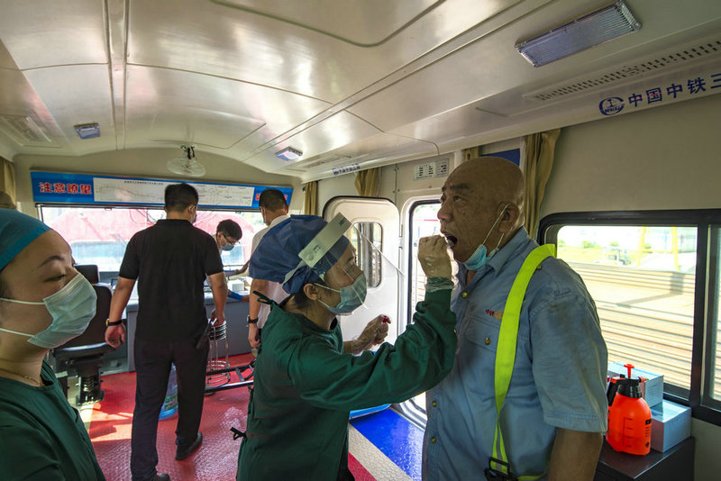 中鐵三局線橋公司黃黃鐵路項(xiàng)目浠水鋪軌基地醫(yī)務(wù)工作者正在進(jìn)行核酸檢測因子取樣