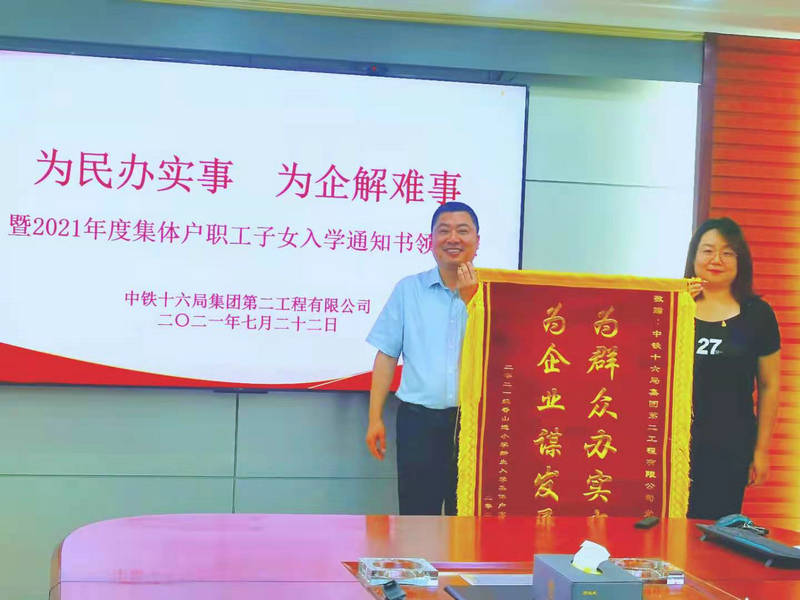 日前,在中鐵十六局二公司天津總部辦公樓,15名一線職工家屬為企業(yè)送錦旗的事引起了員工們的熱議。這面標(biāo)注有“為群眾辦實(shí)事、為企業(yè)謀發(fā)展”金黃大字的錦旗,系學(xué)齡兒童父母一方或雙方均在二公司外地工點(diǎn),公司工會(huì)經(jīng)大力協(xié)調(diào),孩子監(jiān)護(hù)人在順利接受到入學(xué)通知書后聯(lián)名贈(zèng)送的。代表著他們對(duì)公司黨委切實(shí)為其解難題的感激,也是公司各級(jí)組織歷年來下大力為職工辦實(shí)事、解決后顧之憂的一個(gè)縮影。