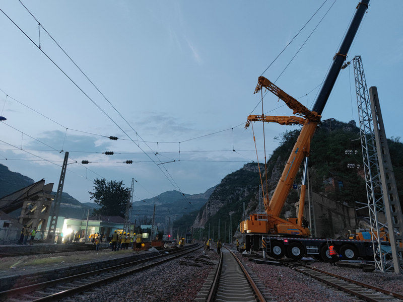 后寨車站上跨橋梁是是上世紀(jì)七十年代修建的人行天橋,跨越車站共五條股道。現(xiàn)因橋體病害嚴(yán)重已廢棄,但高懸在太焦鐵路線上,對行車安全造成重大威脅。中原公司接到拆橋任務(wù)后,公司各級精心組織焦作項(xiàng)目部和設(shè)計(jì)、各配合單位精誠合作,攻堅(jiān)克難。面對疫情防控、汛期施工、地理環(huán)境復(fù)雜等不利因素,在危橋拆除與山體危石爆破交叉施工的不利情況下,項(xiàng)目部強(qiáng)化組織,各部門通力合作,晝夜不懈奮戰(zhàn),從勘察現(xiàn)場、編制報(bào)批方案、拆除接觸網(wǎng)、拆除破碎危橋、接觸網(wǎng)恢復(fù)到線路開通僅用9天時(shí)間,做到了施工文明、質(zhì)量達(dá)標(biāo)、安全可控,體現(xiàn)了中原鐵軍的擔(dān)當(dāng)。