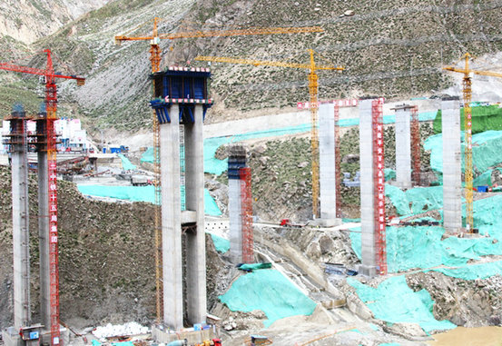 卡如雅魯藏布江大橋橋梁全長734.5米,其中主橋采用變截面預(yù)應(yīng)力混凝土連續(xù)剛構(gòu)箱梁。本次施工的0#塊高8.5米,長13米,設(shè)計混凝土方量474.4立方米,采用一次整體澆筑成型,承重梁采用托架施工方式,箱梁懸臂段采用三角形掛籃施工。