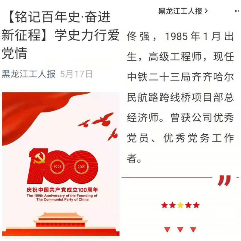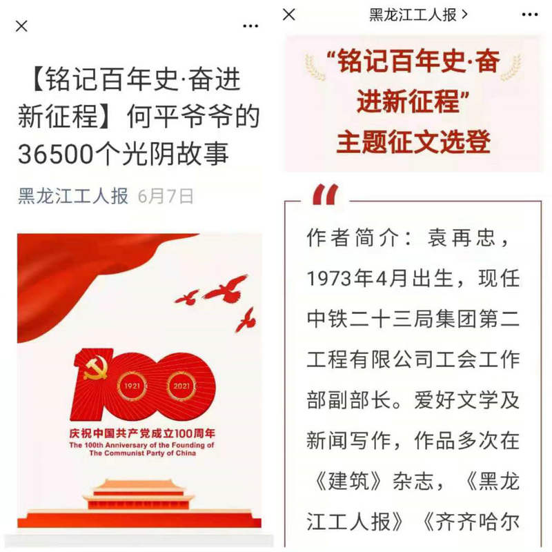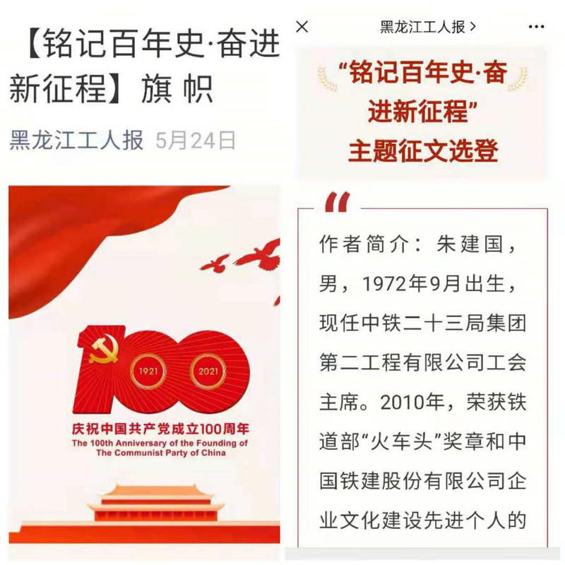 由黑龍江省總工會(huì)融媒體中心、黑龍江工人報(bào)社聯(lián)合舉辦的“銘記百年史、奮進(jìn)新征程”主題征文活動(dòng)評(píng)選結(jié)果日前揭曉。中鐵二十三局集團(tuán)二公司工會(huì)榮獲優(yōu)秀組織獎(jiǎng)的同時(shí),再捧得三個(gè)單項(xiàng)獎(jiǎng)。