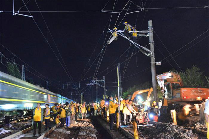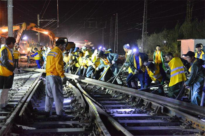 當(dāng)日凌晨2時,隨著一聲令下,作業(yè)人員迅速進入既定崗位,扒道砟聲、切割軌道聲、抬鋼軌的號子聲、機器轟鳴聲此起彼伏,整個施工現(xiàn)場忙而不亂,紛繁有序,現(xiàn)場一片熱火朝天。經(jīng)過1個小時緊張施工拆除9#、11#道岔。凌晨3時破底。凌晨3時40分道岔、軌排就位,連通線路。凌晨4時20分開始上碴、起道、搗固,凌晨6時10分完成作業(yè),順利完工開通。