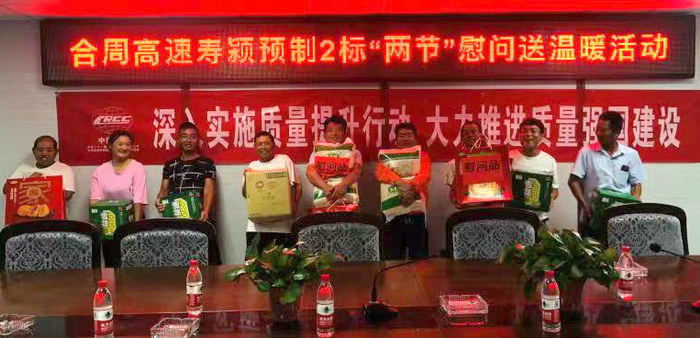 本網(wǎng)安徽阜陽 9月21日訊(通訊員 徐文娟)9月20日,中秋、國慶佳節(jié)將至,中鐵二十一局三公司合周高速壽潁預(yù)制02標(biāo)開展“迎雙節(jié)送溫暖 ”慰問活動,項(xiàng)目部為勞務(wù)隊(duì)工人送上了月餅、大米、大肉、食用油等慰問品和節(jié)日問候,讓深處他鄉(xiāng)的工人們深切感受到家人般濃濃的關(guān)愛之情,使大家備受鼓舞,同時(shí)也增強(qiáng)了項(xiàng)目的凝聚力和向心力。