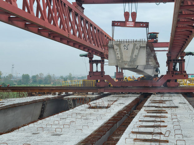 鄭鐵公司黨委書記、執(zhí)行董事林文生到現(xiàn)場包保盯控。8時30分點(diǎn)起,作業(yè)人員迅速到達(dá)指定崗位,9時10分,梁體到位并完成加固支護(hù),9時20正點(diǎn)銷記。10:50完成二廣高速上跨隴海鐵路立交橋項(xiàng)目東半幅(18片)箱梁架設(shè)任務(wù),橋面系施工同時展開。