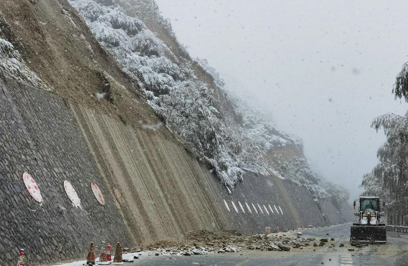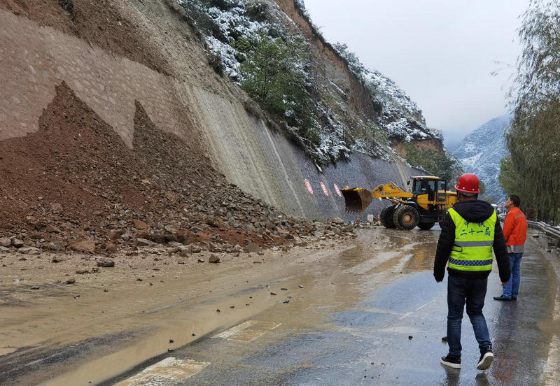 連日降雨導(dǎo)致G566國道部分滑坡段山體松動,不斷滾落的碎石,給道路疏通帶來了極大困難,參加搶險救援的人員不畏險阻,雨雪不止人不息,道路不通人不停,經(jīng)過一上午的緊急清理,終于使G566國道恢復(fù)了正常通行。