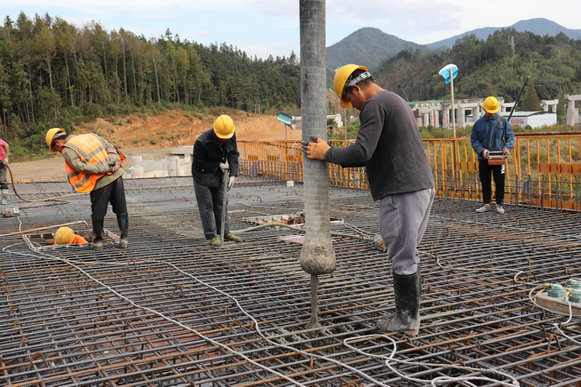 圖為澆筑混凝土施工通過項(xiàng)目班子成員分片包干和目標(biāo)與任務(wù)分解、考核獎罰兌現(xiàn)、績效掛鉤等措施,有效鼓舞了全員的干勁,調(diào)動了施工積極性,大干活動你追我趕,熱情高漲,將為完成年度目標(biāo)任務(wù)奠定堅(jiān)實(shí)基礎(chǔ)。
