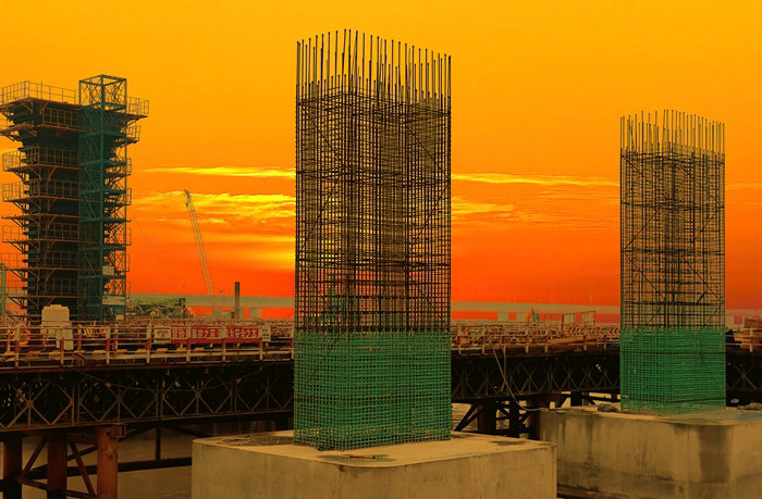 杭甬復(fù)線一期濱?;ネ屑~是亞洲最大的海上互通立交,主線2.4公里、4座拼寬橋1.32公里、8座匝道橋5.9577公里。設(shè)計(jì)樁基1033根,平均長(zhǎng)度約90米,直徑2米。如果把杭甬復(fù)線比作是一部電視劇的話,那么該橋則是“全劇”的“壓軸戲”,對(duì)樹(shù)立十五局的形象、企業(yè)屬地發(fā)展將發(fā)揮不可替代的作用。該項(xiàng)目部不敢有絲毫懈怠,集中人力、機(jī)械設(shè)備、物資等資源,全力以赴打好濱?;ネㄒ粦?zhàn)。今年初在濱海高架施工處于后期階段、一部分力量加快連續(xù)梁掛籃施工的同時(shí),將重心放在互通立交上。20多支棧橋、鋼護(hù)筒、鉆孔、泥漿、承臺(tái)、墩柱、鋼筋籠等施工隊(duì)伍和數(shù)十臺(tái)履帶吊、汽車吊、重型運(yùn)輸車、混凝土泵等大中型機(jī)械設(shè)備和車輛匯集到互通施工現(xiàn)場(chǎng),實(shí)行“大兵團(tuán)作戰(zhàn)法”,對(duì)濱?;ネㄐ纬珊蠂畡?shì)。陸續(xù)開(kāi)工建設(shè)的8條匝道鋼棧橋,是樁基作業(yè),乃至是橋墩施工的前奏曲,一周建一座作業(yè)平臺(tái)的驚人速度,為樁基施工按計(jì)劃進(jìn)行提供了有力保障。為提高工作效率,各施工隊(duì)加強(qiáng)機(jī)械車輛維修保養(yǎng),使履帶吊、罐車、振動(dòng)錘等設(shè)備的完好率、使用率高達(dá)95%,各類專業(yè)技能人員上崗率均在96以上。