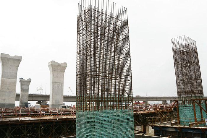 濱?;ネ⒔辉O計為變形苜蓿葉形互通型式,最小曲線半徑 60米,ABCD 匝道設計時速60公里,EFGH 匝道設計時速 40公里,最大縱坡 3.82%。主線2.4公里,8座匝道橋全長 5.9577公里,4 座拼寬橋1.32公里。該橋下部結構為474 根鉆孔樁,平均樁長約 90 米。橋墩634座,其中柱式墩身207 座,墩高 6.9—25.5米。8 米以上的墩柱設有系梁,匝道交匯處和拼寬橋設有蓋梁。