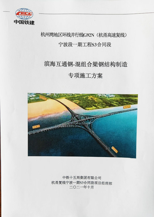 濱?;ネ屑~,是亞洲最大的海上立交,引起浙江省、寧波市和集團(tuán)公司各級(jí)領(lǐng)導(dǎo)的高度關(guān)注。編寫互通專項(xiàng)施工方案是干好工程的重要前提。項(xiàng)目部在7月份出臺(tái)長(zhǎng)達(dá)299頁(yè)的濱?;ネ▽?shí)施性施工組織設(shè)計(jì)基礎(chǔ)上,再次指定專人編寫鋼混組合梁制造專項(xiàng)施工方案。鋼結(jié)構(gòu)部分制作、拼裝、涂裝層等工藝復(fù)雜,施工質(zhì)量、過程控制、檢驗(yàn)等必須滿足設(shè)計(jì)文件和標(biāo)準(zhǔn)規(guī)范要求。編制人員查閱資料、仔細(xì)解讀圖紙,對(duì)鋼混組合梁有足夠的認(rèn)識(shí)。編,依據(jù)國(guó)家、省、市34個(gè)規(guī)范標(biāo)準(zhǔn),14部國(guó)家法律、條例、辦法和66份規(guī)范性文件進(jìn)行編寫。