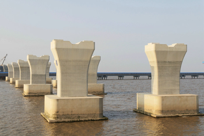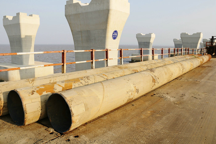 濱海高架橋主線長6900米,上部結(jié)構(gòu)采用8孔40米+77孔50米預(yù)制架設(shè)箱梁+77.5+135+77.5連續(xù)梁。下部結(jié)構(gòu)為鉆孔樁+承臺+花瓶墩,橋梁跨越擬建和在建的排污管道、原油管道、給誰通道、取水盾構(gòu)隧道、LNG管線和通信光纜。為滿足施工需要,濱海高架橋設(shè)計高6米、長6900米、寬8米的棧橋,棧橋是施工必不可少的附屬工程,沒有棧橋的存在,便無法完成各項施工任務(wù)。棧橋是租賃一家單位的,每平米1天的租金是23.7元,僅高架橋的棧橋,每天的租金高達(dá)163530元。為便于樁基、底板、承臺、墩身24小時作業(yè),濱海高架橋還架設(shè)了上百座作業(yè)平臺。隨著濱海高架橋主體施工進(jìn)入后期階段,作業(yè)平臺和大部分鋼棧橋的使命已經(jīng)完成,今年以來陸續(xù)將上百座平臺拆除,拆除主線棧橋也勢在必行。