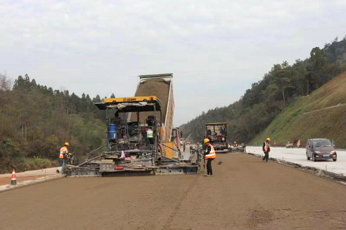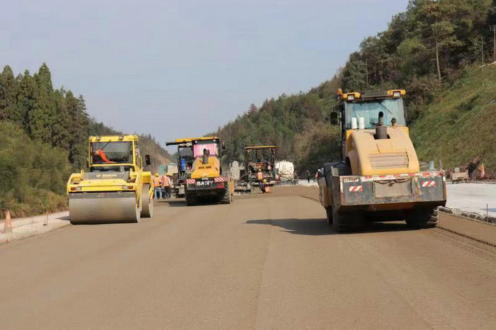 圖為攤鋪水穩(wěn)層 由中鐵二十一局三公司承建的池祁高速12A標(biāo),主要工程為路基橋涵施工,路基占標(biāo)段總長(zhǎng)的三分之二,由于線路布設(shè)在陡峭的山坡,與鄉(xiāng)道、高鐵交叉,并跨越河流低洼地帶,還面對(duì)高壓改線等拆遷難題,加之地質(zhì)松軟,安全風(fēng)險(xiǎn)高,施工生產(chǎn)面臨巨大挑戰(zhàn),給施工帶來(lái)一定難度。按照倒排工期,為盡快投入施工,在前期籌備過(guò)程中,從組建水穩(wěn)料拌合站到料源組織把工作往前趕,自產(chǎn)水穩(wěn)石料快馬加鞭日夜不停生產(chǎn),以滿足路基水穩(wěn)攤鋪需求。同時(shí)對(duì)成型路基采取合格一段驗(yàn)交一段,確保驗(yàn)交、攤鋪兩不誤。通過(guò)全方位加大施工投入,優(yōu)化施工工序和人員包保責(zé)任人制舉措,使路基水穩(wěn)攤鋪施工有序快速推進(jìn),保證了路基水穩(wěn)攤鋪壓實(shí)質(zhì)量。